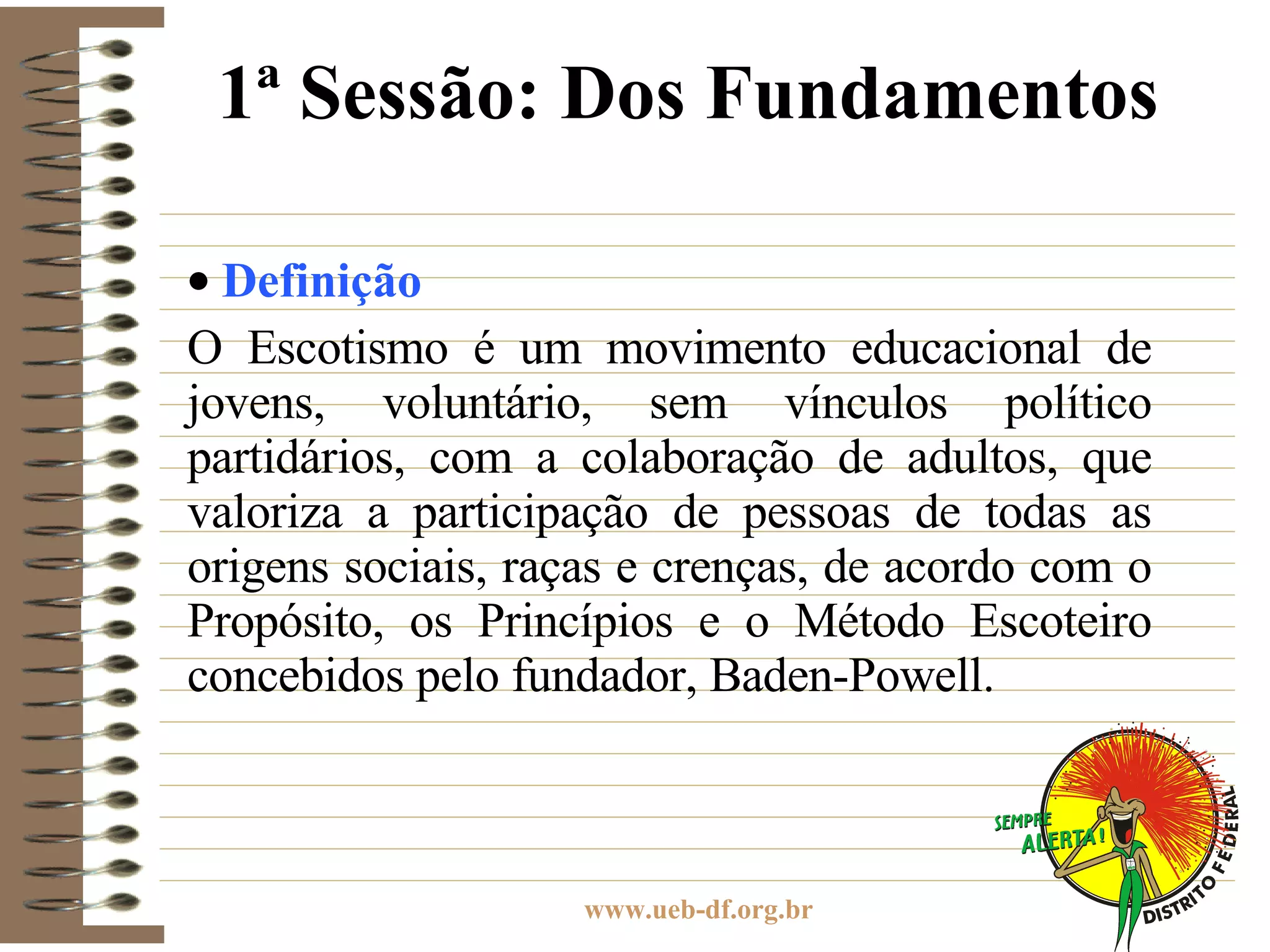 O documento discute os fundamentos, propósitos e princípios do Escotismo como um movimento educacional voltado para jovens. Ele define Escotismo como um movimento sem vínculos políticos que valoriza a participação de pessoas de todas as origens. O propósito é contribuir para o desenvolvimento dos jovens, especialmente do caráter, enquanto os princípios são definidos na Promessa e Lei Escoteiras.