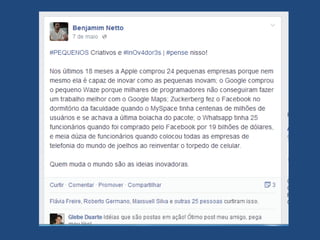 O documento apresenta a trajetória profissional de Benjamim Netto, destacando sua experiência em marketing e gestão no Senac/RN. Enfatiza a importância da inovação e do engajamento no ambiente empresarial, sugerindo que as empresas devem identificar oportunidades e se adaptar às tendências. Além disso, menciona a relevância da comunicação personalizada e de se manter motivado e proativo no desenvolvimento de ideias.