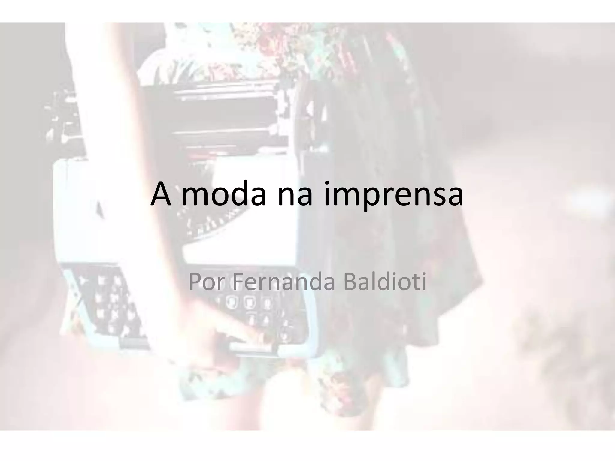 O documento descreve a evolução da moda na imprensa, desde a propagação por contato direto nos séculos XVIII até a influência das novelas na década de 1960. Também aborda o público-alvo, a rotina dos jornalistas de moda, os tipos de reportagens e as fontes de pesquisa utilizadas.