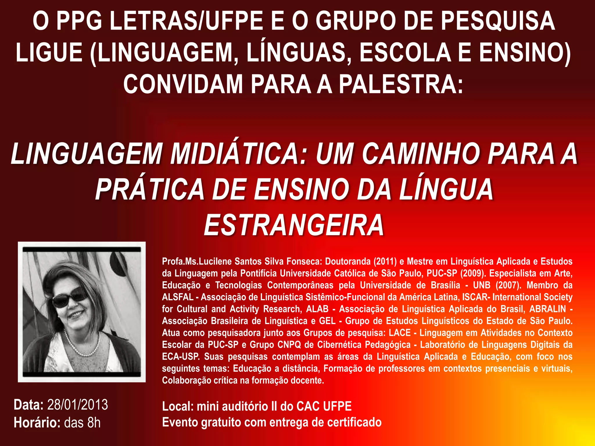 O documento anuncia uma palestra sobre linguagem midiática como caminho para o ensino de línguas estrangeiras ministrada pela Professora Lucilene Santos Silva Fonseca. A palestra ocorrerá no mini auditório II do CAC UFPE no dia 28 de janeiro de 2013 às 8h e contará com certificados de participação.