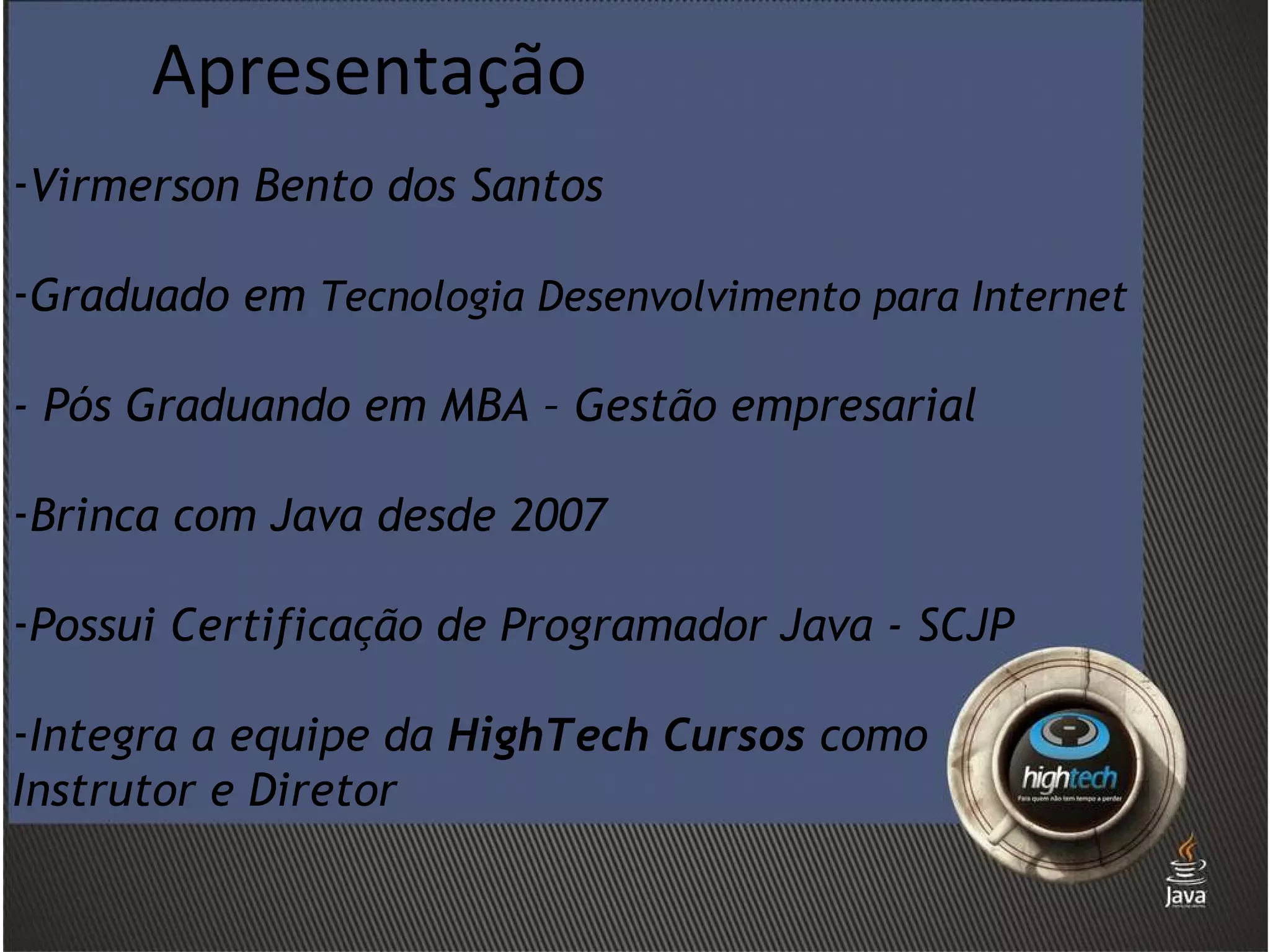 Virmerson Bento dos Santos apresenta seu currículo como graduado em Tecnologia Desenvolvimento para Internet e MBA em Gestão Empresarial. Ele é instrutor e diretor da HighTech Cursos, onde ensina Java desde 2007. O documento fornece informações sobre Java, incluindo sua história, uso em dispositivos e plataformas, além de salários e oportunidades para programadores Java no Brasil e em Mato Grosso do Sul.