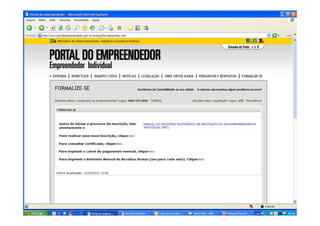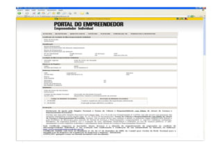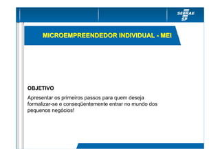O documento fornece informações sobre como se tornar um Microempreendedor Individual (MEI). Resume os principais requisitos para se enquadrar como MEI, como ter receita anual de até R$36.000,00 e no máximo um empregado. Também explica as obrigações tributárias do MEI, como pagar mensalmente uma taxa fixa que inclui contribuições para o INSS e impostos. Por fim, descreve os benefícios previdenciários do MEI, como aposentadoria e auxílio-doença.