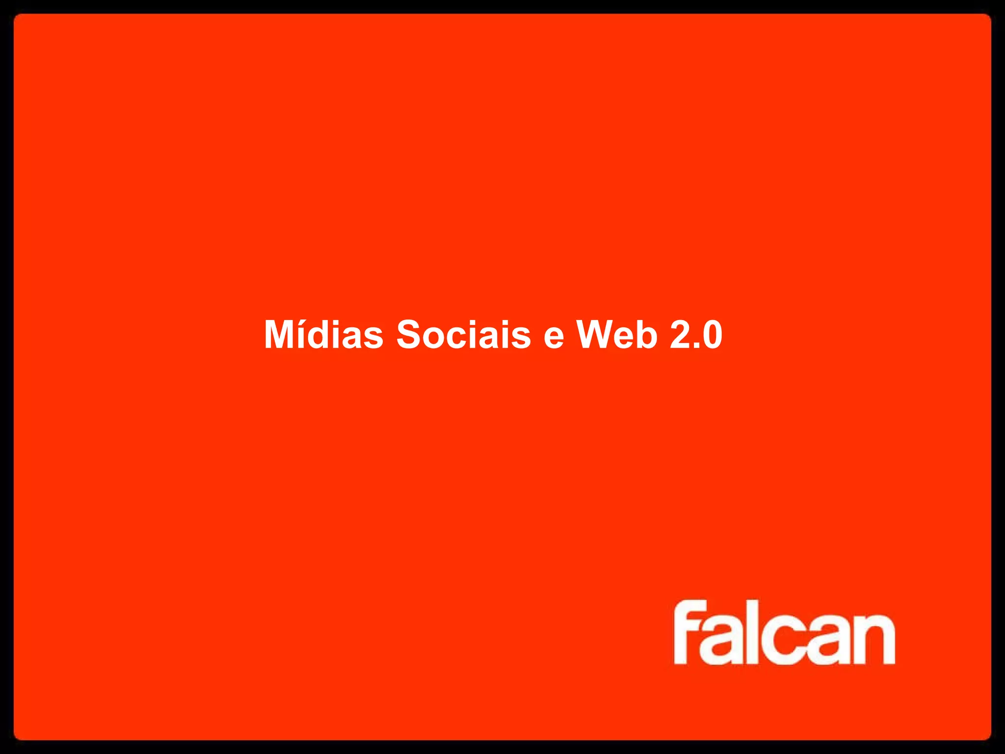 O documento discute as mídias sociais e a internet. Ele descreve a agência Falcan e seu foco em integrar mídias online e offline. Também fornece estatísticas sobre o uso da internet no Brasil e explica como as mídias sociais como Orkut, blogs, Twitter e YouTube podem ser usadas para marketing.