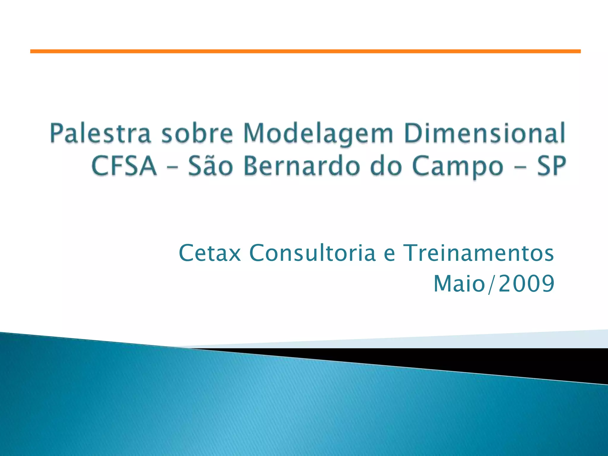O documento apresenta uma palestra sobre modelagem dimensional realizada pela Cetax, uma empresa especializada em business intelligence e data warehousing. O instrutor, Marco Antonio Garcia, possui ampla experiência na área e aborda conceitos fundamentais como fatos, dimensões, granularidade e chaves primárias. Também discute as vantagens e desvantagens da modelagem dimensional, incluindo técnicas para lidar com mudanças lentas nos dados.