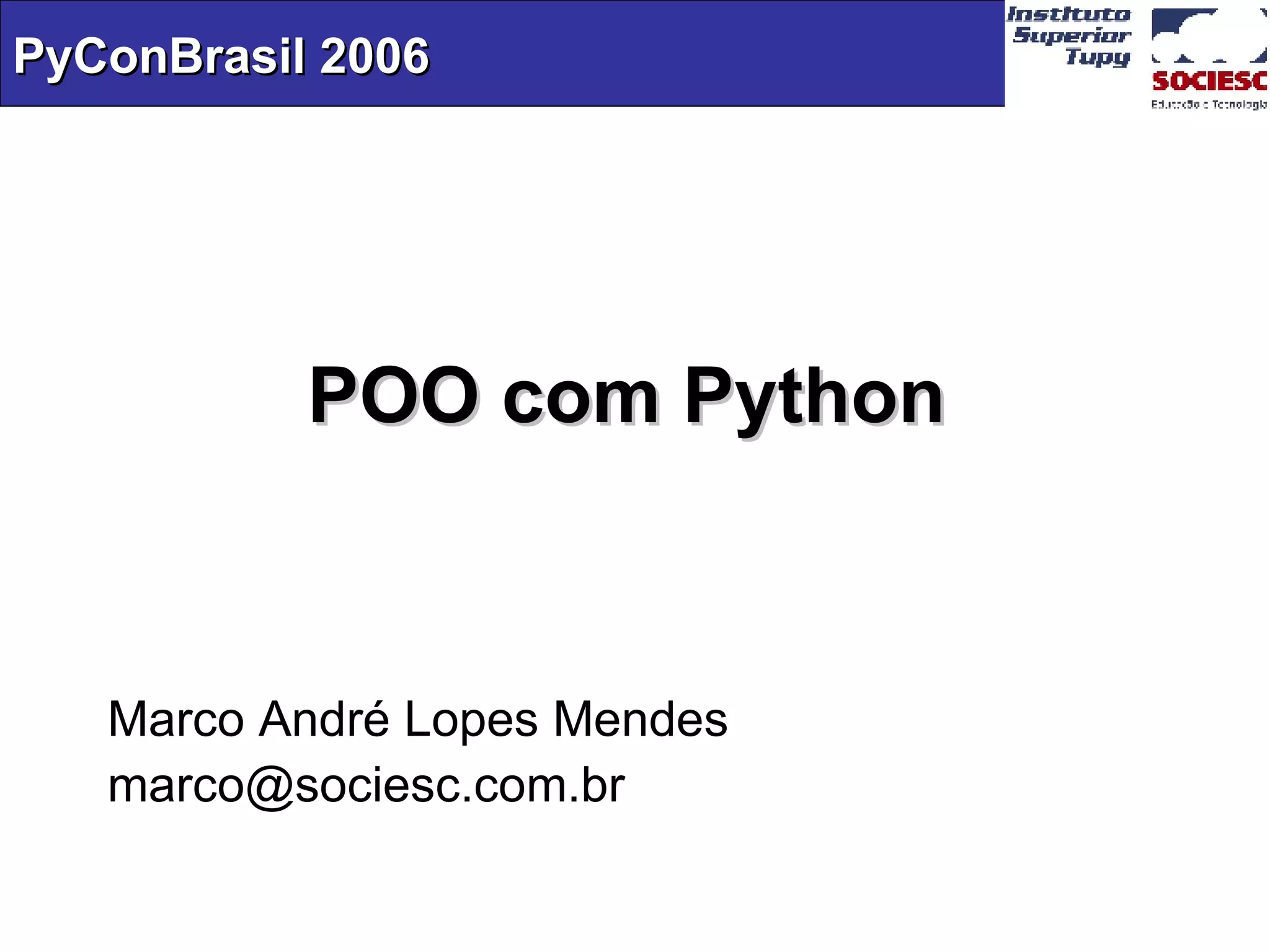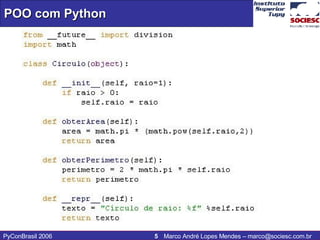 ![POO com Python Marco André Lopes Mendes [email_address]](https://image.slidesharecdn.com/palestra-na-pyconbrasil2-uso-de-poo-com-python1772/75/Uso-de-POO-com-Python-PyconBrasil-2-1-2048.jpg)