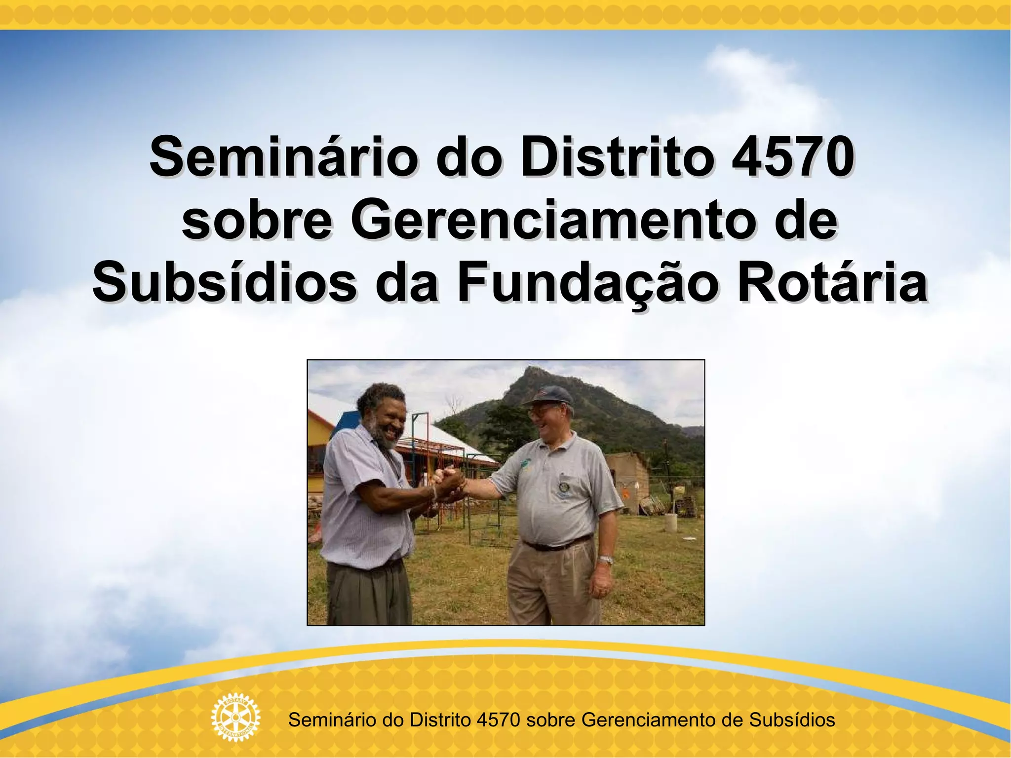 O seminário discutiu a criação e solicitação de subsídios da Fundação Rotária. Apresentou como funciona o Fundo Anual para Programas e o Fundo Mundial, e como os fundos são distribuídos. Ensinou sobre elaborar projetos bem-sucedidos e sustentáveis, e como escrever propostas para solicitar subsídios distritais e globais.