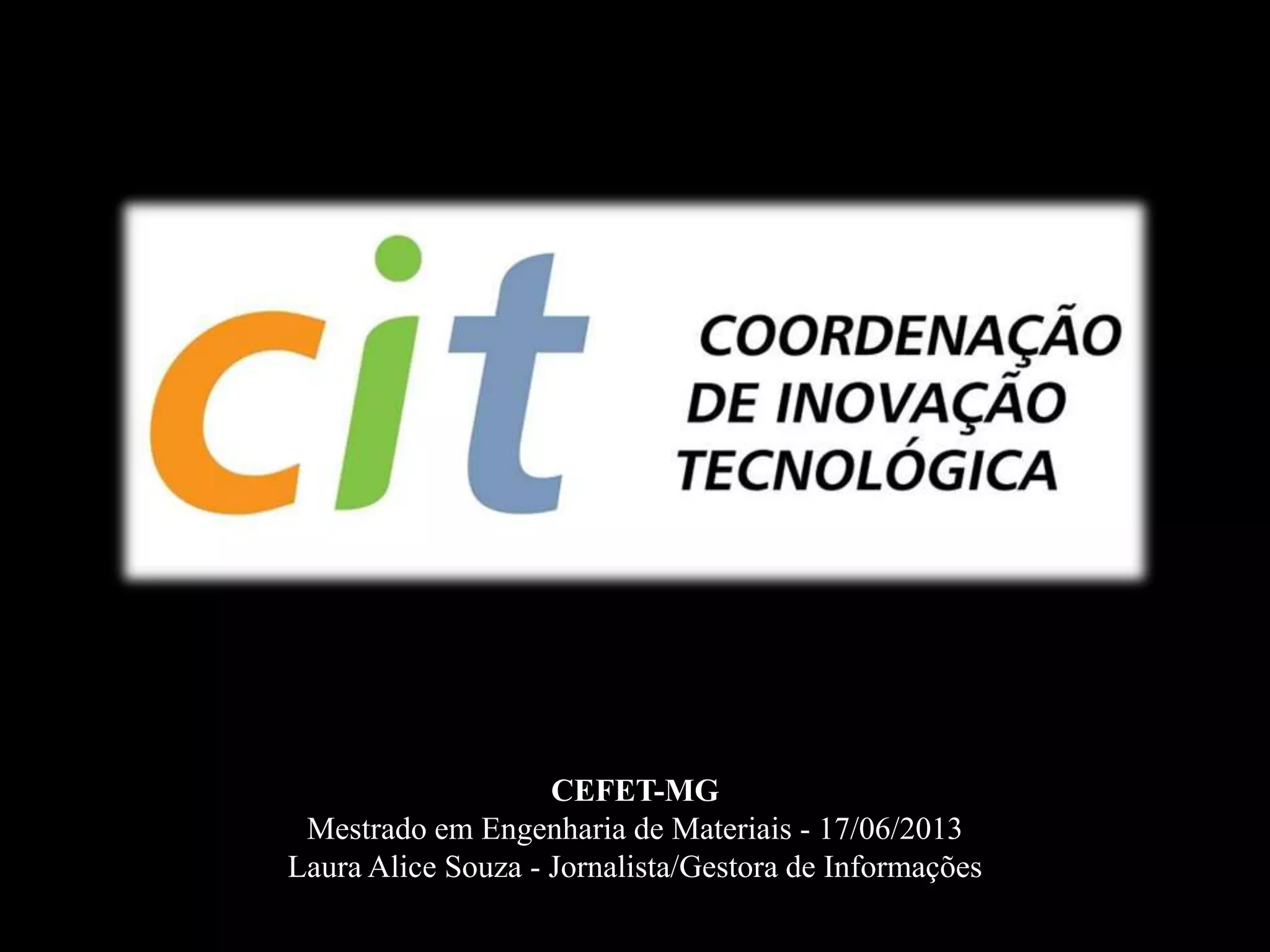 Este documento fornece um resumo da Coordenação Geral de Inovação Tecnológica (CIT) do CEFET-MG. A CIT é responsável pela formulação e execução da política de propriedade intelectual e transferência de tecnologia da instituição. O documento descreve as atividades e objetivos da CIT, como orientar pesquisadores sobre propriedade intelectual e buscar proteção para novas tecnologias, além de promover a cultura da inovação no CEFET-MG.