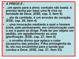 O documento discute a importância da prece como meio de comunicação com Deus. Ele explica que a prece pode ser um pedido, agradecimento ou louvor, e ajuda a abrir os canais mentais para entender a resposta divina, que nem sempre vem da forma esperada. Também ressalta a necessidade de preparar o coração antes de orar, livrando-o de sentimentos negativos.