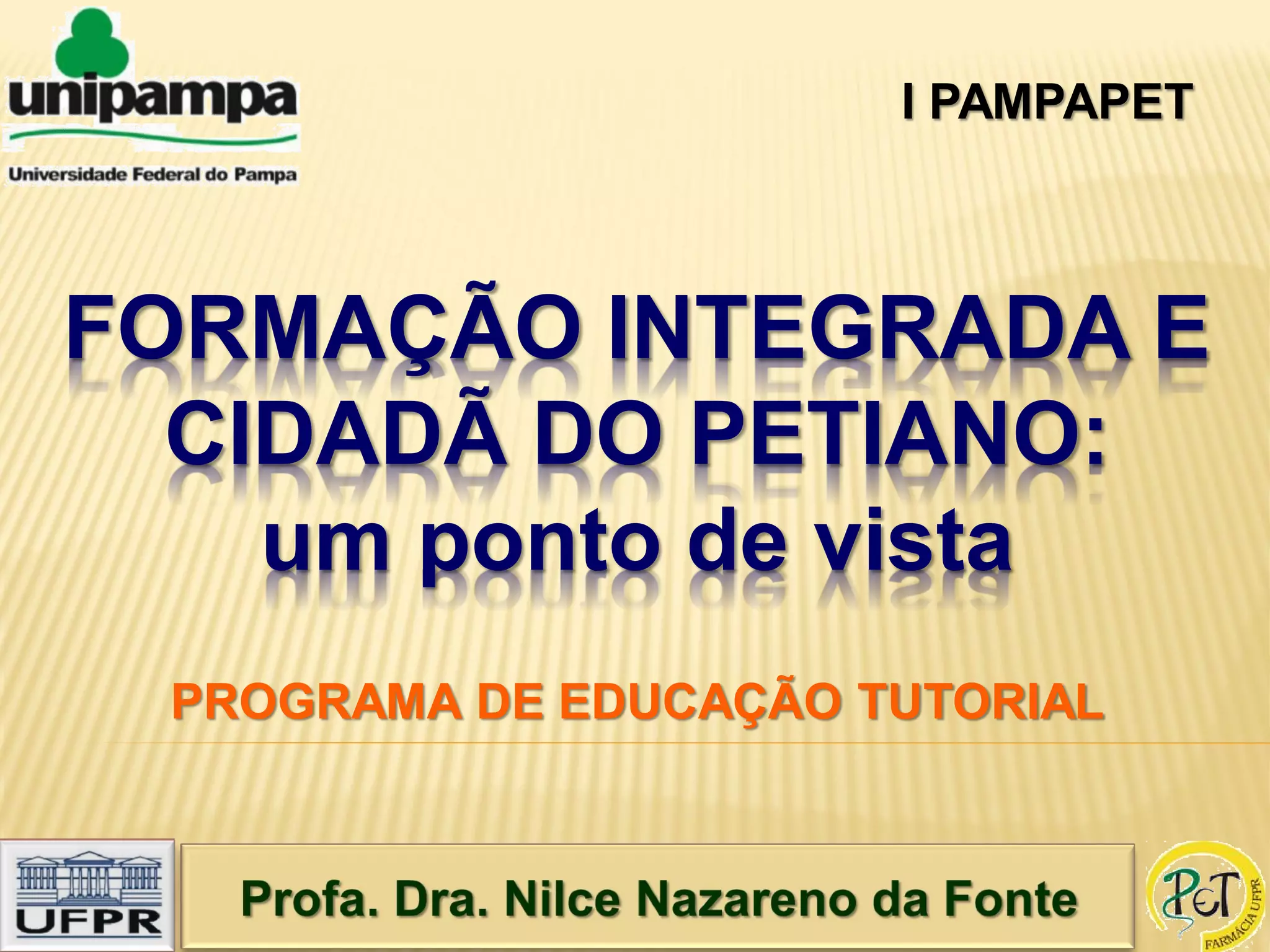 O documento discute a formação ideal versus a real na universidade e como o Programa de Educação Tutorial (PET) complementa a formação acadêmica de forma integrada e cidadã. O PET promove atividades, discussões e reflexões coletivas que desenvolvem competências como consciência crítica, responsabilidade social e liderança, formando profissionais versáteis capazes de trabalhar em equipe.