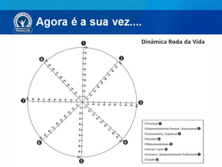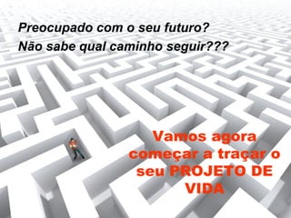 O documento discute a importância de se elaborar um projeto de vida para direcionar suas escolhas e metas. Ele apresenta a roda da vida com 8 áreas importantes e dá etapas para desenvolver um projeto, incluindo se conhecer, definir uma missão, fazer parcerias, estabelecer metas de curto, médio e longo prazo, gerenciar tempo e finanças. O objetivo é integrar vontades e necessidades para uma vida com significado.