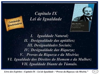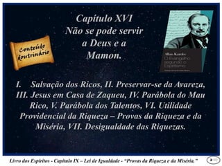 Este documento discute a desigualdade entre riqueza e pobreza. Apresenta diferentes pontos de vista sobre como Deus usa a riqueza e a pobreza para experimentar os homens de maneiras diferentes e como ambas as condições podem ser uma tentação. Também discute que na vida após a morte, o que realmente importa não é a riqueza material que se acumulou, mas sim as boas obras e qualidades morais desenvolvidas.
