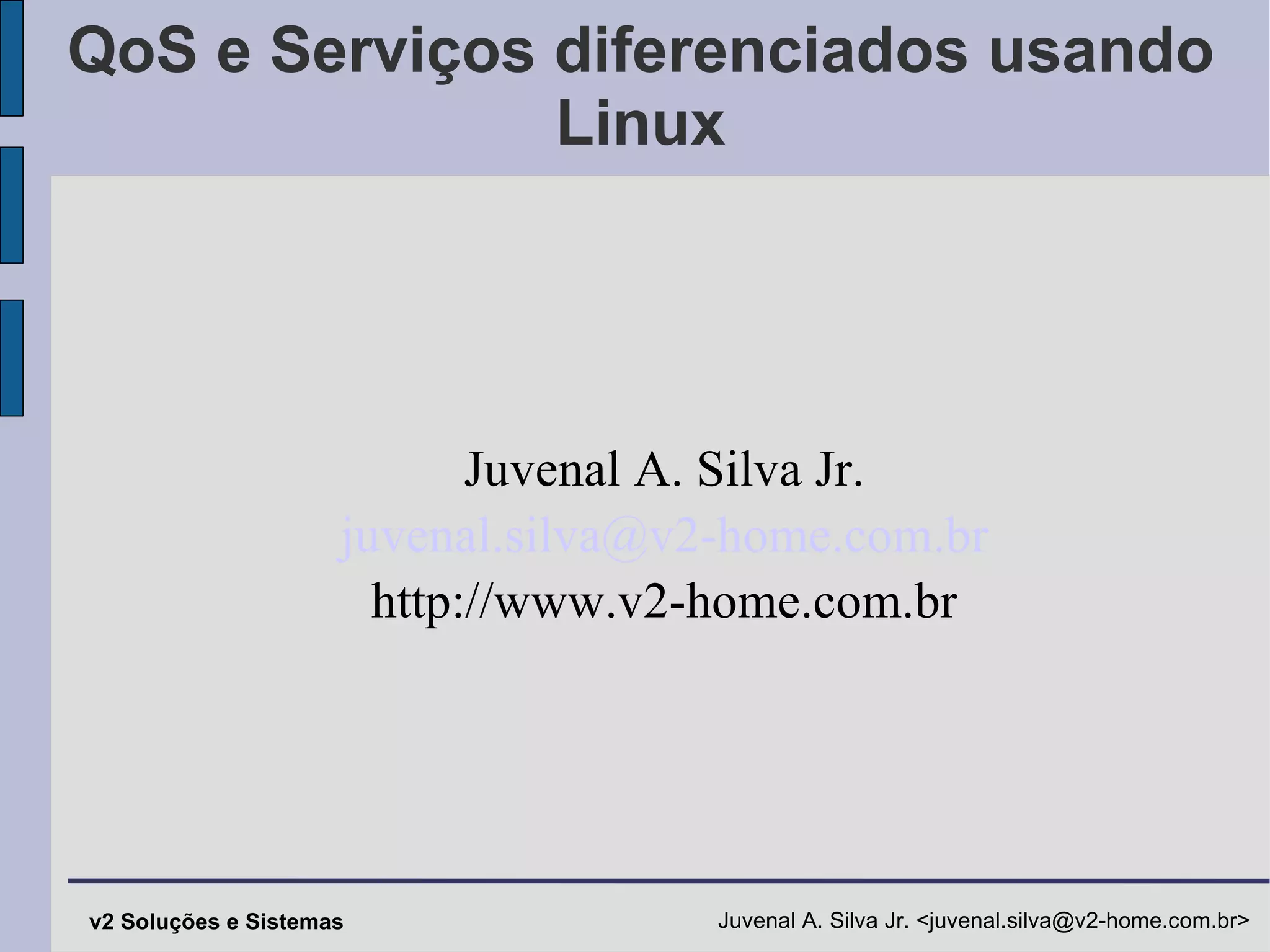 O documento discute técnicas de Qualidade de Serviço (QoS) e serviços diferenciados usando Linux. Ele explica como configurar o tráfego de rede usando as disciplinas de fila HTB e filtros para priorizar e limitar fluxos de acordo com endereço IP, porta e protocolo.
