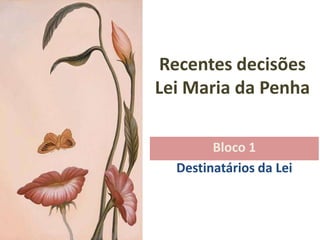 1. O documento discute quem pode ser considerado destinatário da Lei Maria da Penha, incluindo transexuais, homossexuais e ex-namoradas.
