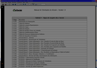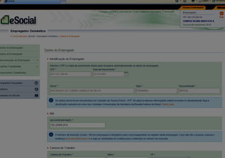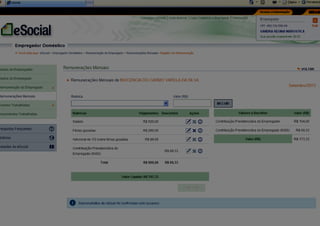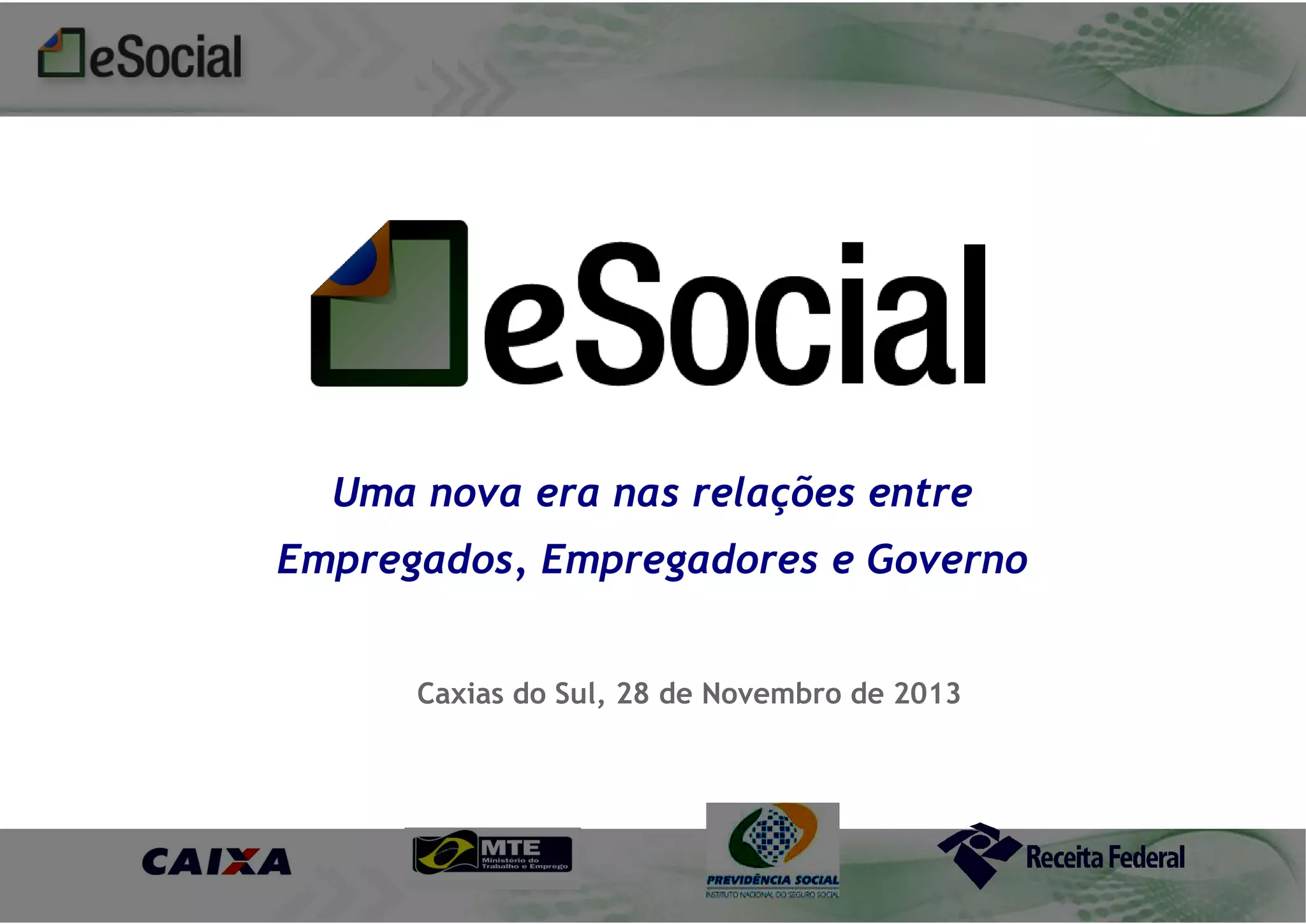 O documento descreve a implementação do eSocial, um sistema digital unificado para registro de informações trabalhistas, previdenciárias e tributárias. O eSocial visa simplificar as obrigações dos empregadores e aprimorar a qualidade dos dados do governo, substituindo diversos documentos atuais por meio de um único canal digital. A implementação ocorrerá de forma gradual até 2015, começando por empregadores domésticos e pequenos produtores rurais.