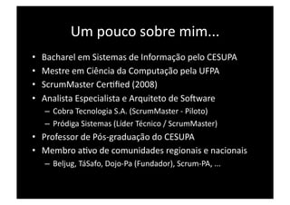 O documento apresenta uma introdução ao Scrum e metodologias ágeis, descrevendo: