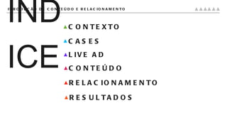 O documento discute a produção de conteúdo e relacionamento nas mídias sociais. Ele aborda o contexto histórico da descentralização da mídia com a revolução digital, apresenta casos de conteúdo e relacionamento em plataformas como o Live Ad, e discute métricas e avaliação de resultados para medir o engajamento do público-alvo e os impactos das estratégias de conteúdo e relacionamento.