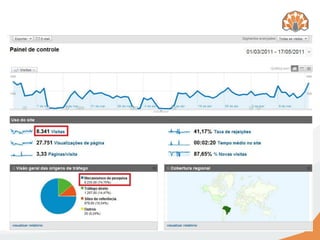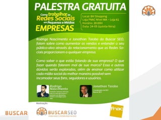 Este documento fornece informações sobre SEO (otimização para mecanismos de busca) e SMO (marketing de mídia social). Ele discute como analisar palavras-chave, concorrência e público-alvo, e como usar mídias sociais para construir marca e gerar tráfego qualificado para sites. O documento enfatiza que SEO envolve mais do que otimização técnica e requer estratégia, criatividade e inteligência competitiva.