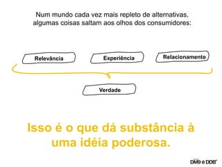 O documento discute a importância das ideias para marcas e como elas podem ser mais do que apenas anúncios publicitários. Ideias podem criar relacionamentos, experiências e alternativas de negócios que mobilizam consumidores. É destacado que ideias bem-sucedidas requerem planejamento, processo, convergência de mentes e execução para terem impacto.