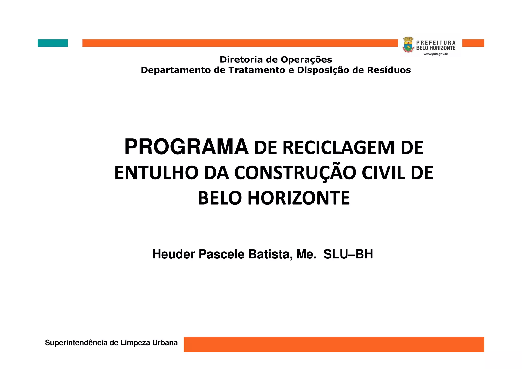 O documento descreve o programa de reciclagem de entulho da construção civil de Belo Horizonte, que inclui 31 unidades de recebimento de pequenos volumes, 3 estações de reciclagem de entulho, e um aterro para resíduos da construção civil. O programa tem processado em média 400 toneladas de entulho por dia desde 2005.