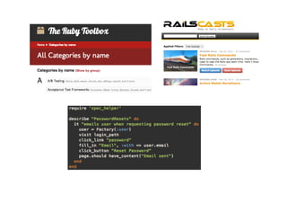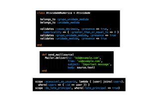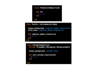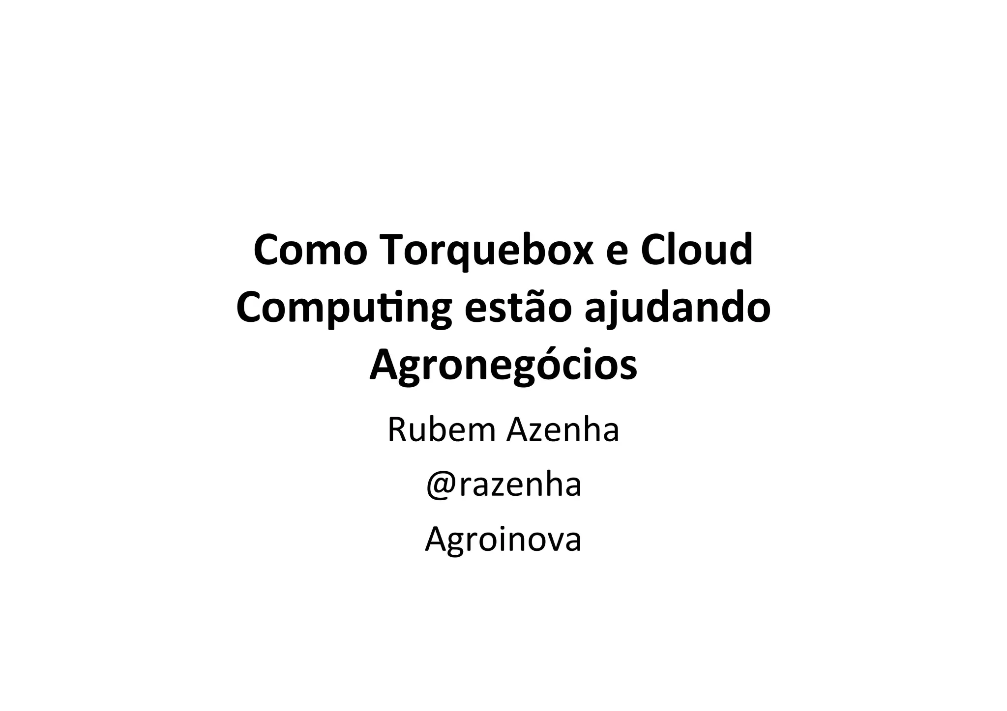 O documento discute como a plataforma Torquebox e computação em nuvem estão ajudando o agronegócio. Ele explica por que a linguagem Ruby on Rails foi escolhida para reescrever um aplicativo, destacando sua simplicidade, qualidade e produtividade. Também descreve como Torquebox fornece funcionalidades de mensageria e agendamento com facilidade, aproveitando o poder da plataforma Java.