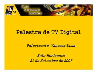 A palestra aborda os conceitos básicos da TV digital, incluindo vantagens como melhor qualidade de imagem e som, além de sistemas de compressão de vídeo como H.264. Detalha também aspectos técnicos dos moduladores ISDB-TB e a importância da compressão e transmissão eficiente de sinais digitais. A apresentação foi conduzida por Vanessa Lima em Belo Horizonte em setembro de 2007.