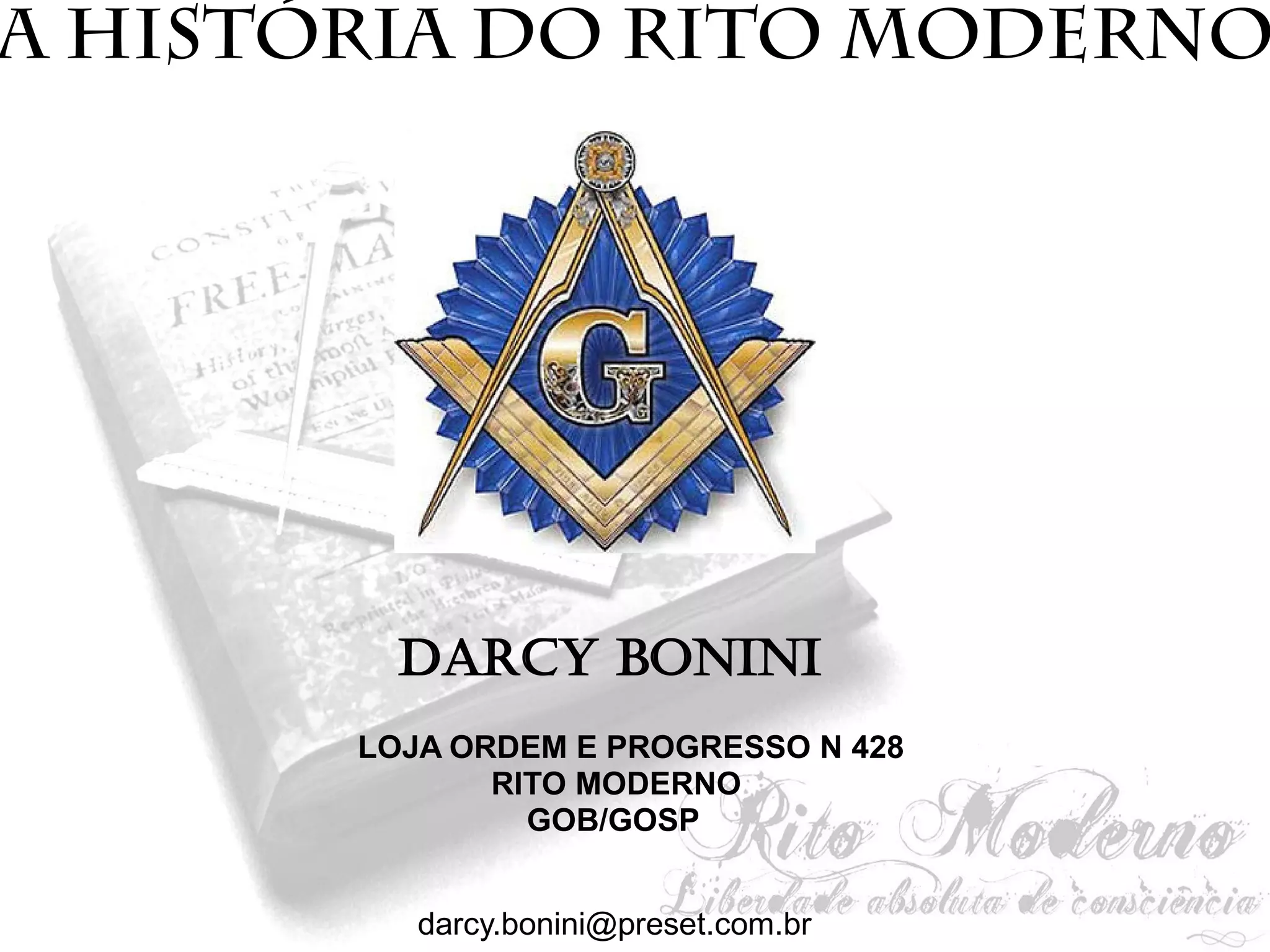 O documento descreve a história do Rito Moderno, começando com sua origem na França no século 18 como uma tentativa de simplificar os rituais maçônicos e remover referências religiosas. O Rito Moderno foi criado pelo Grande Oriente da França em 1773 com três graus simbólicos e posteriormente expandiu-se para sete graus. Após várias revisões, os rituais do Rito Moderno foram uniformizados em 1785.