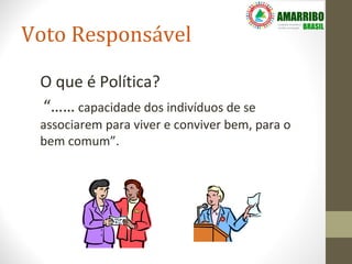 O documento discute a importância do voto responsável e consciente para manter políticos honestos e competentes. Ele explica que o voto permite ao cidadão escolher bons candidatos e fiscalizar os eleitos, e destaca a necessidade de não votar em candidatos desonestos ou que tentam comprar votos. O documento também descreve os papéis do prefeito e vereadores.