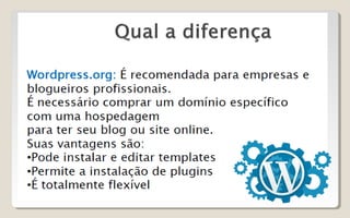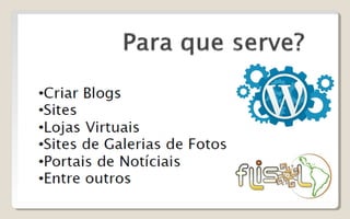 Este documento fornece uma introdução ao WordPress, incluindo seus requisitos, funcionalidades, vantagens e como identificar sites que o utilizam. Explica que o WordPress é um sistema de gerenciamento de conteúdo flexível e gratuito que permite a publicação e edição fácil de conteúdo na web, e é amplamente utilizado por grandes empresas e organizações.