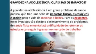 A gravidez na adolescência traz riscos físicos e psicológicos para a gestante e o bebê, como complicações de saúde e parto prematuro. Geralmente causa o abandono escolar da adolescente e dificuldades futuras de emprego. O pai frequentemente abandona a gestante, deixando todo o fardo para a família dela.
