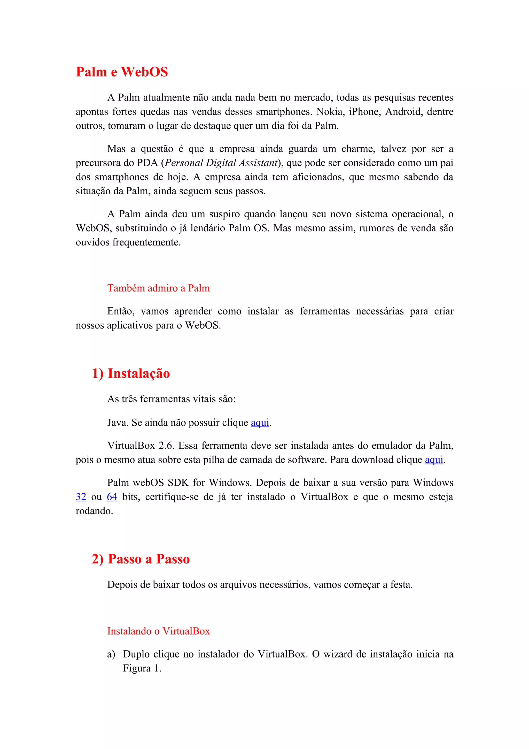 Este documento fornece instruções para instalar as ferramentas necessárias para desenvolver aplicativos para o sistema operacional WebOS da Palm em um ambiente de desenvolvimento baseado no Eclipse. As ferramentas incluem o VirtualBox, o Palm webOS SDK e plugins para o Eclipse que fornecem suporte ao WebOS. Passo a passo detalhados são fornecidos para a instalação de cada ferramenta.