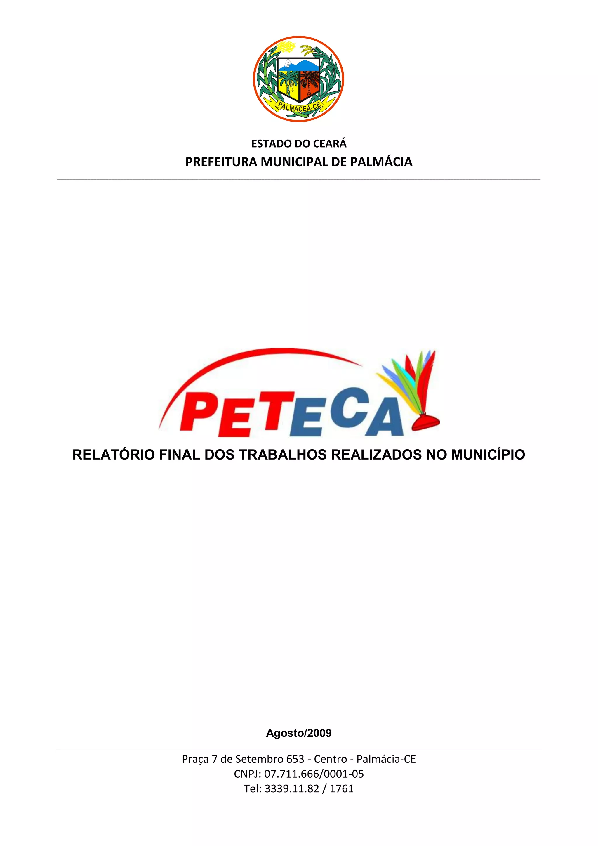 O relatório descreve um programa realizado no município de Palmácia para combater o trabalho infantil. O programa incluiu oficinas para professores e coordenadores, palestras sobre os impactos do trabalho infantil, e atividades nas escolas envolvendo 860 alunos. Autoridades locais e órgãos participaram para apoiar os direitos das crianças. O relatório avalia positivamente o material didático e envolvimento, mas aponta o clima como desafio.
