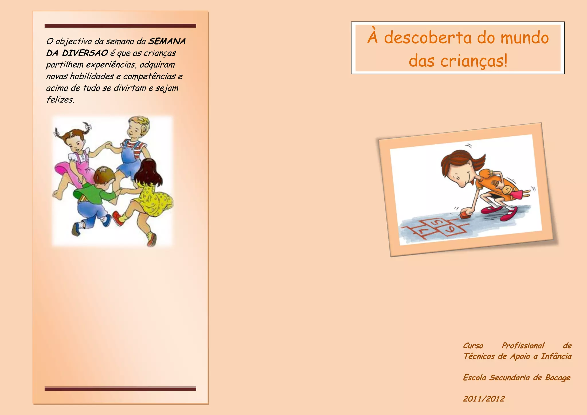 O documento descreve a programação de atividades para uma semana dedicada à diversão e descoberta do mundo para crianças, com o objetivo de partilharem experiências, adquirirem novas habilidades e se divertirem. A semana inclui visitas a museus, parques, passeios e workshops, sempre com refeições incluídas.