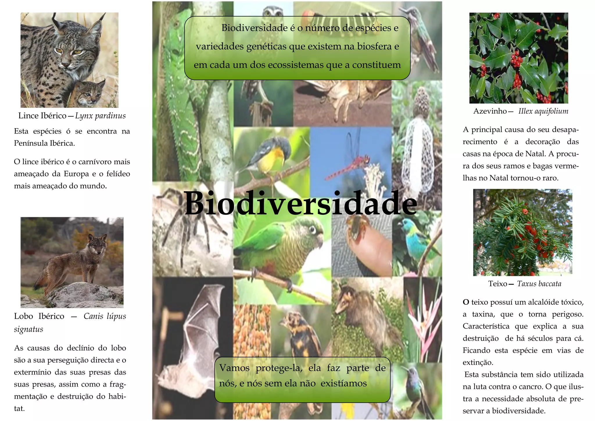 O documento discute a importância da biodiversidade e apresenta exemplos de espécies ameaçadas de extinção em Portugal, incluindo o lince ibérico, o lobo ibérico, o azevinho e o teixo. Apresenta as principais ameaças a essas espécies, como a caça, a destruição do habitat e o uso de partes das plantas. Defende a necessidade de preservar a biodiversidade e proteger essas espécies ameaçadas.