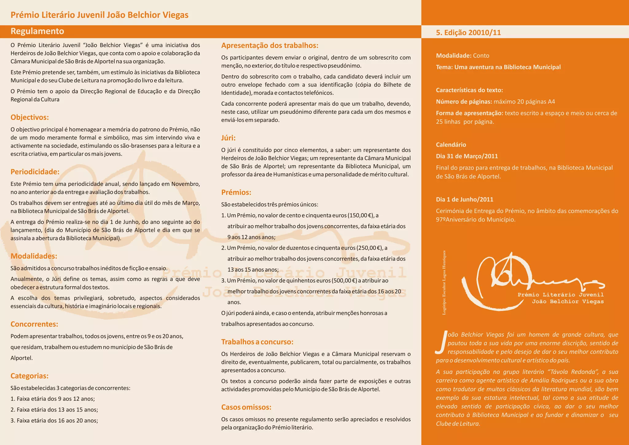 Este regulamento descreve as regras do Prémio Literário Juvenil "João Belchior Viegas", que visa promover a leitura e escrita criativa entre jovens de São Brás de Alportel. Os participantes devem enviar contos com o tema "Uma aventura na Biblioteca Municipal" até 31 de março. Há prémios de 150, 250 e 500 euros para as três faixas etárias: 9-12, 13-15 e 16-20 anos. O prémio será entregue em 1 de junho.