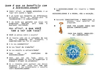 Acessibilidade é um direito de locomoção e comunicação para pessoas com deficiência ou mobilidade reduzida. A acessibilidade beneficia a todos, criando uma sociedade justa e igualitária sem obstáculos. Todos devemos refletir sobre como promover a acessibilidade em nossos espaços de vida e trabalho.