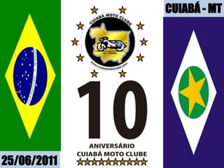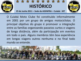 O Cuiabá Moto Clube foi constituído informalmente em 2001 e promove a integração entre motociclistas por meio de passeios e viagens. O documento descreve a festa de aniversário de 10 anos do clube, que ocorrerá na sede da ASSINFRA e contará com estrutura para receber os motociclistas, shows musicais, exposições e prazo de patrocínio.