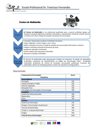 O documento descreve o perfil de um Técnico de Multimédia, incluindo o que é a profissão, o que faz, e onde pode trabalhar. O plano curricular para a formação inclui disciplinas nas áreas da formação sociocultural, científica e técnica, com foco em design, comunicação, audiovisuais e técnicas de multimédia.