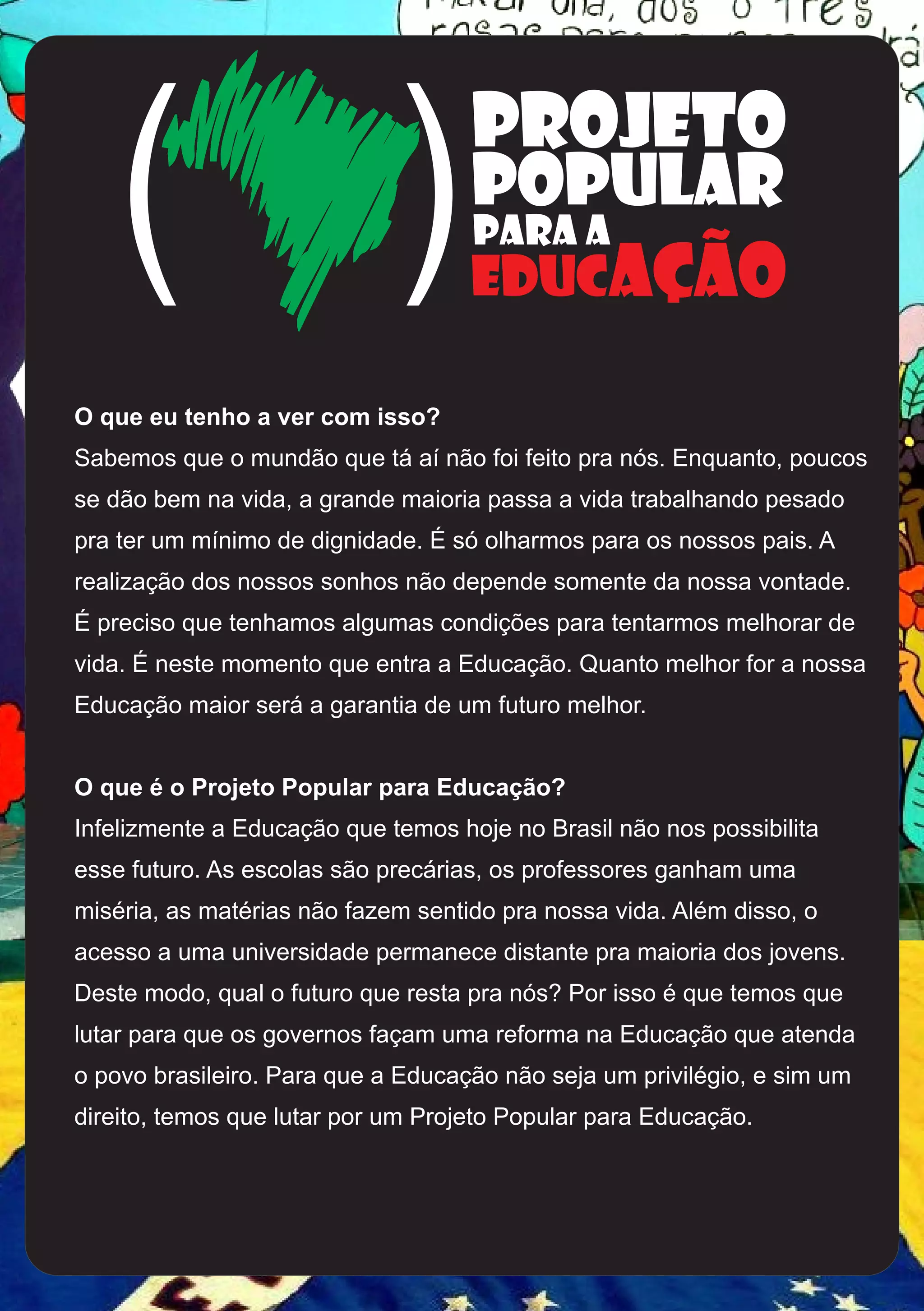 O documento discute a importância da educação para a garantia de um futuro melhor e a luta por um projeto popular de educação no Brasil. Atualmente, a educação brasileira é precária, com escolas ruins, professores mal pagos e conteúdos desconectados da vida real. Além disso, o acesso à universidade é distante para a maioria dos jovens, limitando suas oportunidades. Há a necessidade de reformar o sistema educacional para que seja um direito de todos, não um privilégio, através de um projeto popular de educação