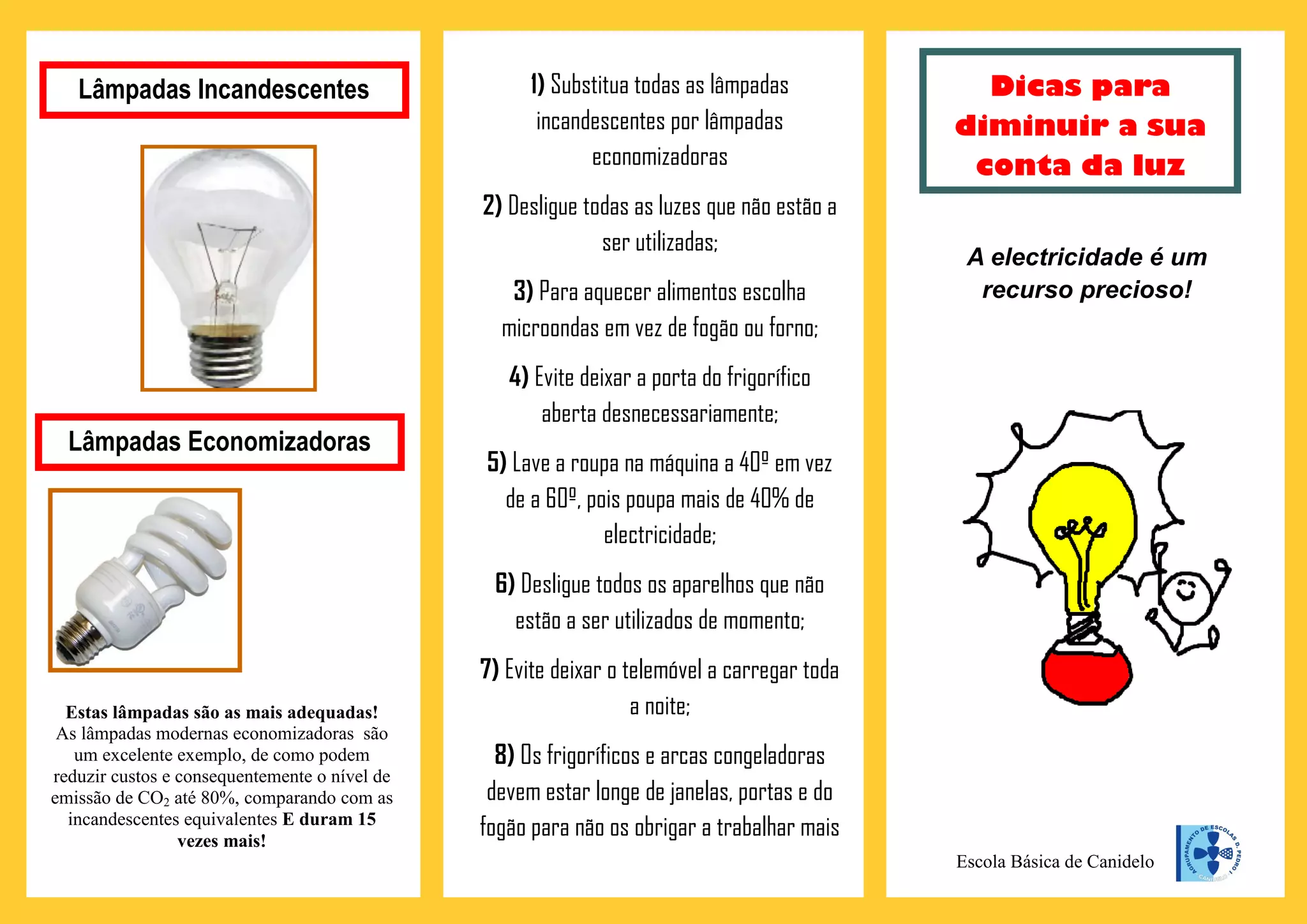 1) Substitua lâmpadas incandescentes por lâmpadas econômicas e desligue luzes desnecessárias para poupar energia.