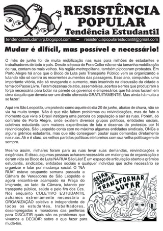 O documento descreve protestos estudantis que ocorreram em junho em Porto Alegre e São Leopoldo reivindicando transporte público gratuito e melhorias em saúde. Em São Leopoldo, ativistas criaram o Bloco de Luta NARUASão Léo para articular demandas de estudantes, trabalhadores e moradores e realizaram acampamento reivindicando suas pautas.