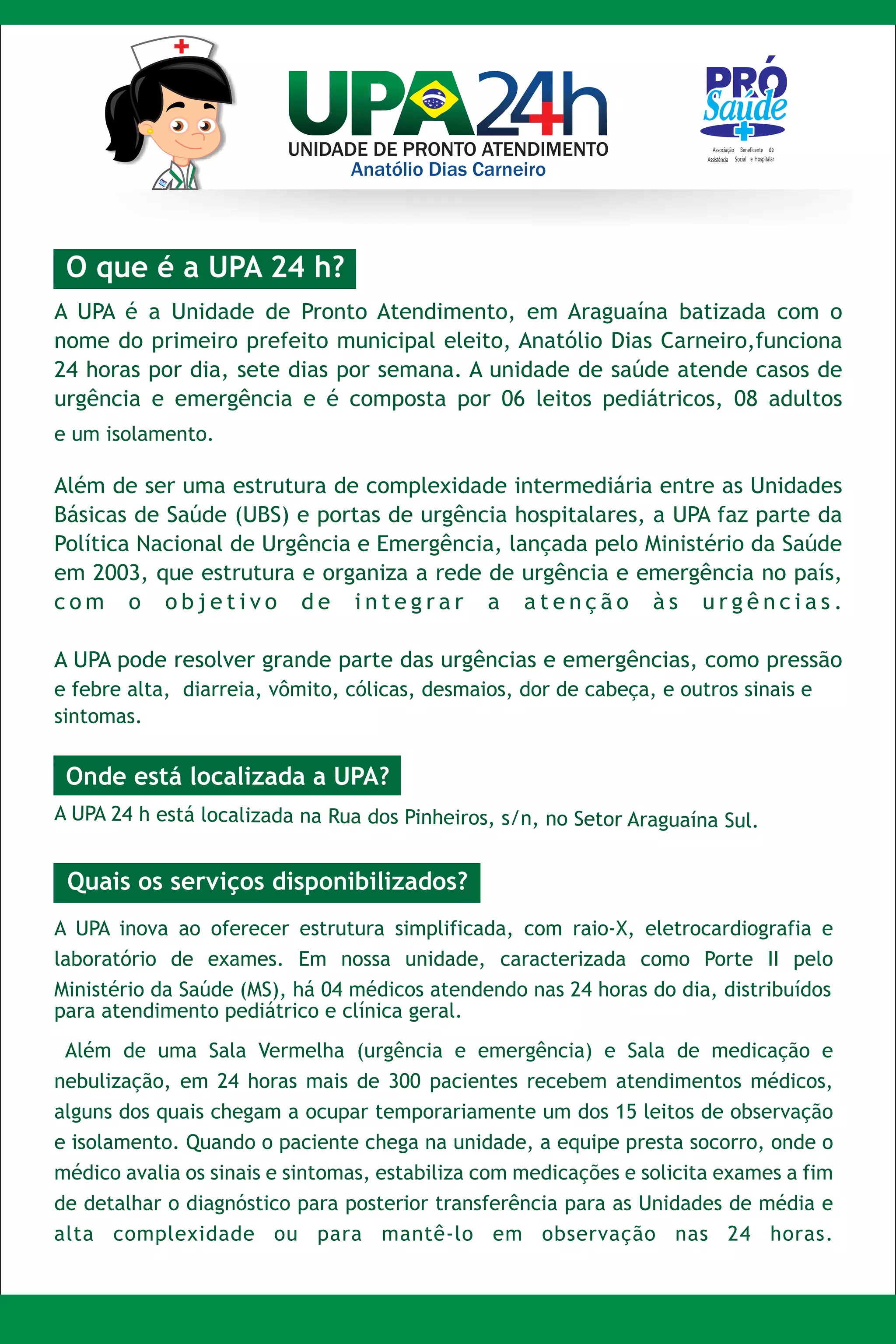 O documento descreve a Unidade de Pronto Atendimento (UPA) 24h Anatólio Dias Carneiro em Araguaína, Tocantins. A UPA funciona 24 horas por dia para atender casos de urgência e emergência. Ela agora classifica os pacientes por nível de risco, atendendo primeiro os casos mais graves, para melhorar o atendimento e reduzir o tempo de espera.