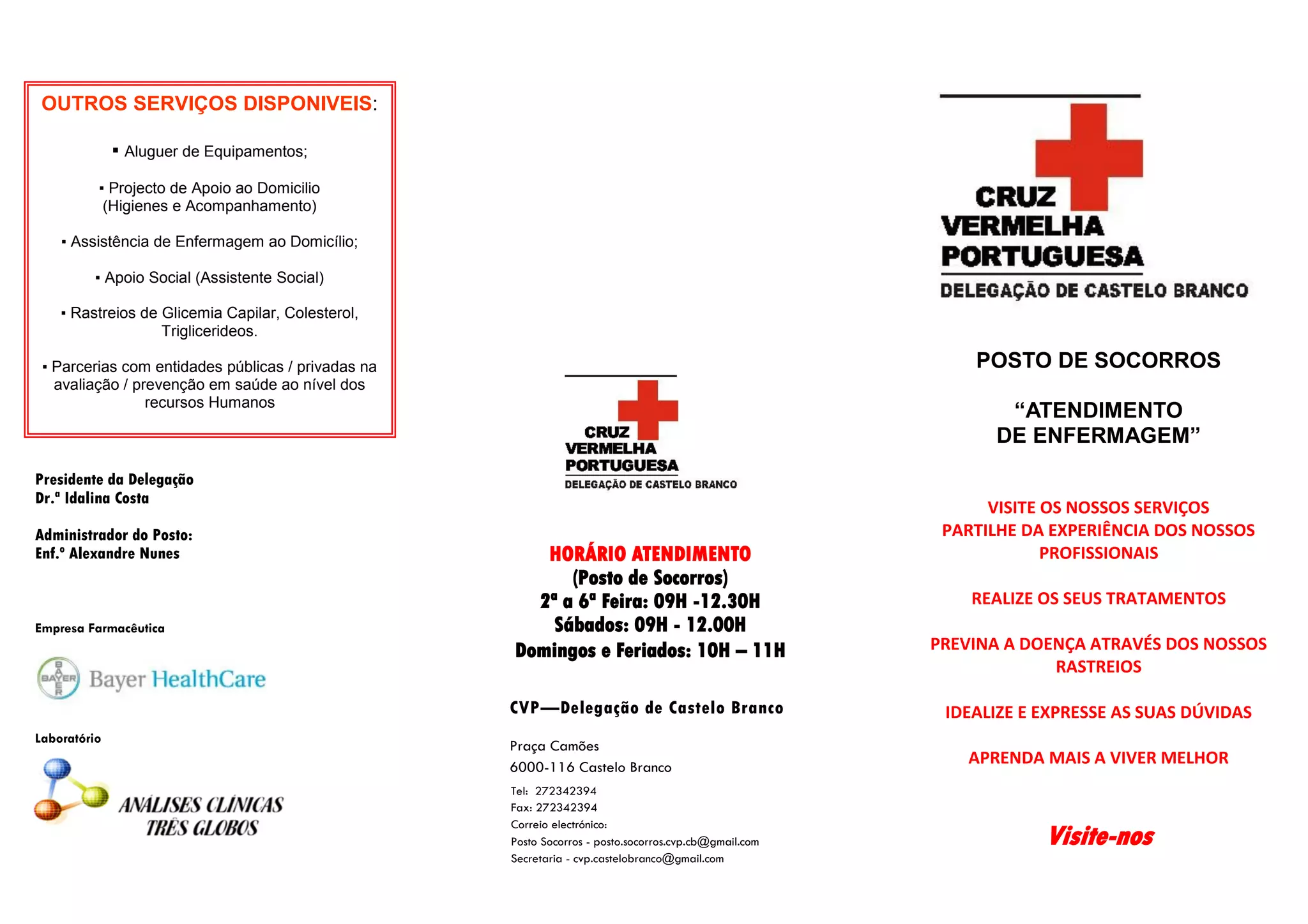 O documento descreve os serviços de enfermagem disponíveis no Posto de Socorros da Cruz Vermelha Portuguesa em Castelo Branco, incluindo análises clínicas, tratamento de feridas, administração de injetáveis, e enfermagem em diversas especialidades. O Posto tem como objetivo fornecer cuidados de saúde acessíveis à população através de acordos com outras entidades. Os preços aplicados são acessíveis de acordo com os materiais utilizados.