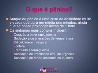 O documento discute o aumento dos ataques de pânico durante os primeiros dias de calor do ano. Sintomas como alterações respiratórias e cardíacas, suores e dificuldade em dormir podem ser desencadeados pelas mudanças de temperatura e luminosidade. O texto fornece dicas para lidar com esses períodos, como relaxamento preventivo e buscar ajuda profissional caso os sintomas piorem temporariamente.