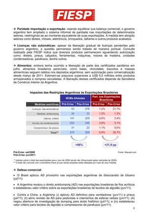 A presidente argentina, Cristina Kirchner, visitará o Brasil para inaugurar a embaixada da Argentina e oficializar sua candidatura nas eleições de outubro. A economia argentina teve um crescimento de 9,9% no PIB e de 9,2% na produção industrial no primeiro trimestre de 2011, enquanto a corrente de comércio bilateral com o Brasil atingiu US$ 18,4 bilhões. Restrições argentinas nas importações de produtos brasileiros continuam a causar perdas significativas, com estimativas de mais de US$ 6,5 milhões em prejuízos.