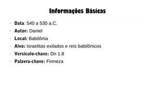O livro de Daniel foi escrito por Daniel durante o exílio babilônico e aborda as revelações divinas e a soberania de Deus sobre nações e líderes. Ele narra histórias sobre a honra de Deus por meio de Daniel e suas visões apocalípticas, enfatizando a vitória sobre a maldade e a restauração final dos judeus. Além disso, relaciona profecias que apontam para Jesus Cristo e reafirma a confiança no controle divino ao longo da história.