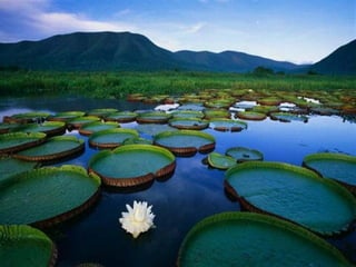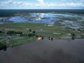 O documento descreve o Pantanal Matogrossense, sua localização no Centro-Oeste do Brasil, abrangendo 12 municípios de Mato Grosso e Mato Grosso do Sul. Apresenta seu clima quente e úmido no verão e frio e seco no inverno, com períodos de cheias e secas. Detalha suas diversas micro-regiões e a rica biodiversidade da região, tanto vegetal quanto animal. A pecuária é a principal atividade econômica e representa uma ameaça, assim como a mineração