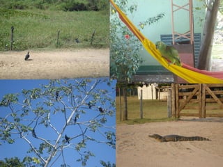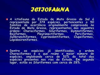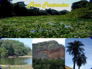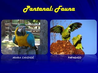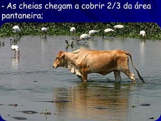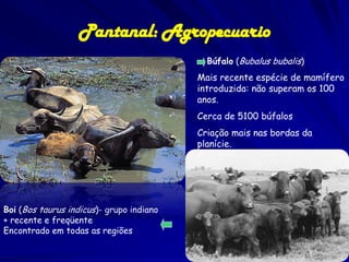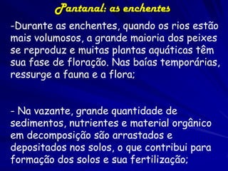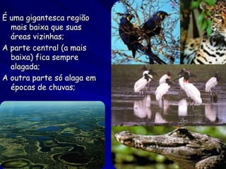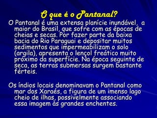 O documento descreve o Pantanal, a maior planície alagável do Brasil. Apresenta informações sobre sua localização, relevo, clima, hidrografia, ciclo das águas e impactos das atividades humanas na região, como pecuária, pesca, agricultura e mineração. Também fornece detalhes sobre a fauna, flora e economia do Pantanal.