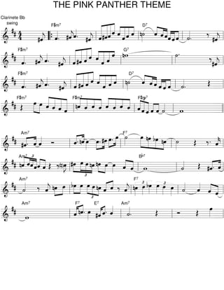 A partitura fornece a música tema do filme "A Pantera Cor-de-Rosa", com a melodia principal tocada no clarinete em Si bemol e acompanhada por acordes de jazz em várias mudanças harmônicas.