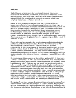 O documento resume a história da panificação desde os tempos pré-históricos até a Idade Média, destacando o surgimento da panificação fermentada e as diferentes variedades de pão consumidas pelos egípcios, gregos e romanos. Também descreve os principais ingredientes do pão, como a farinha, água e fermento, e suas funções no processo de panificação.