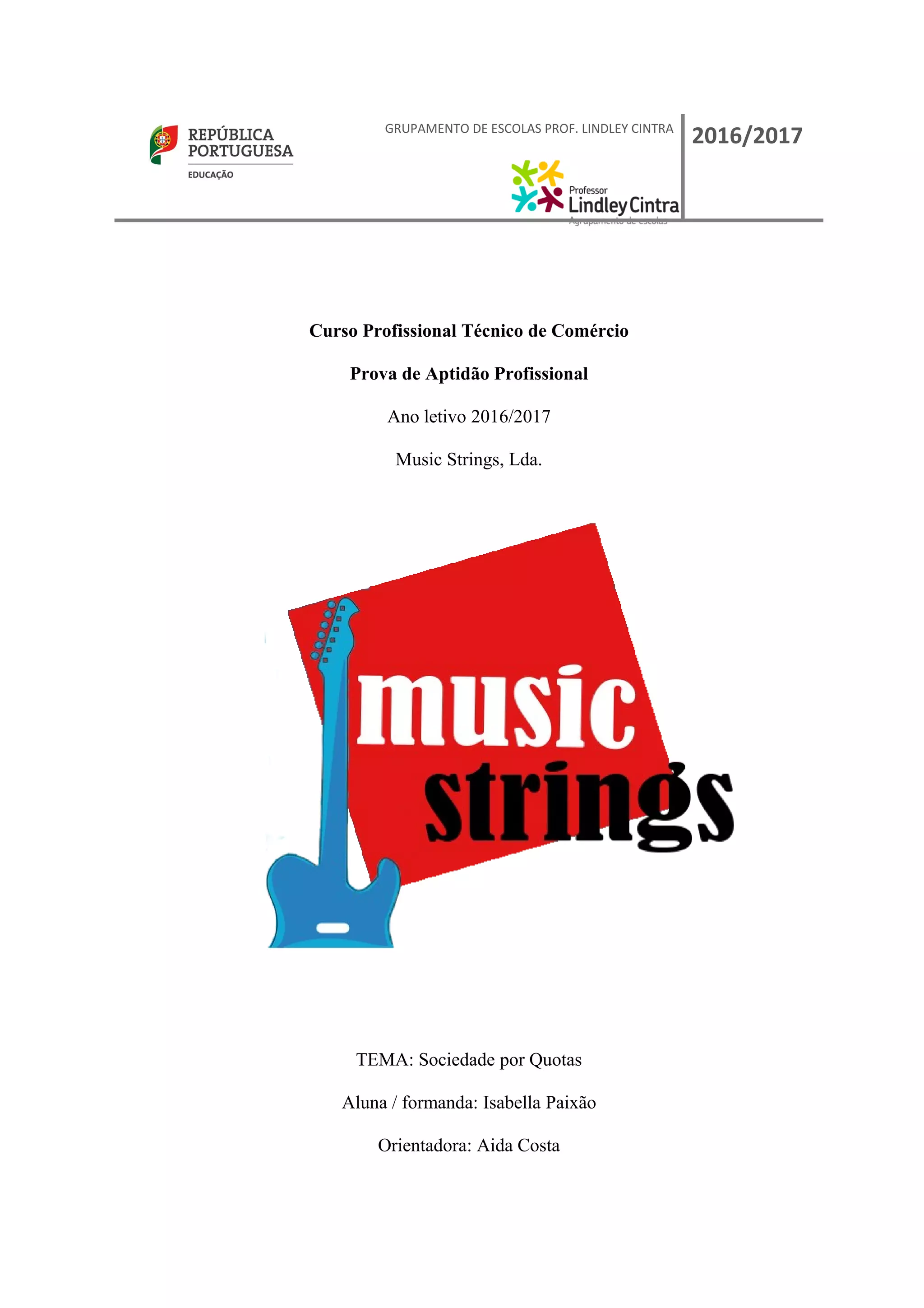 Este documento apresenta os detalhes do plano de negócios para uma loja de instrumentos musicais fictícia chamada Music Strings Lda., incluindo o contrato de sociedade, plano de marketing, estudo de mercado, layout da loja e documentação contábil e financeira.